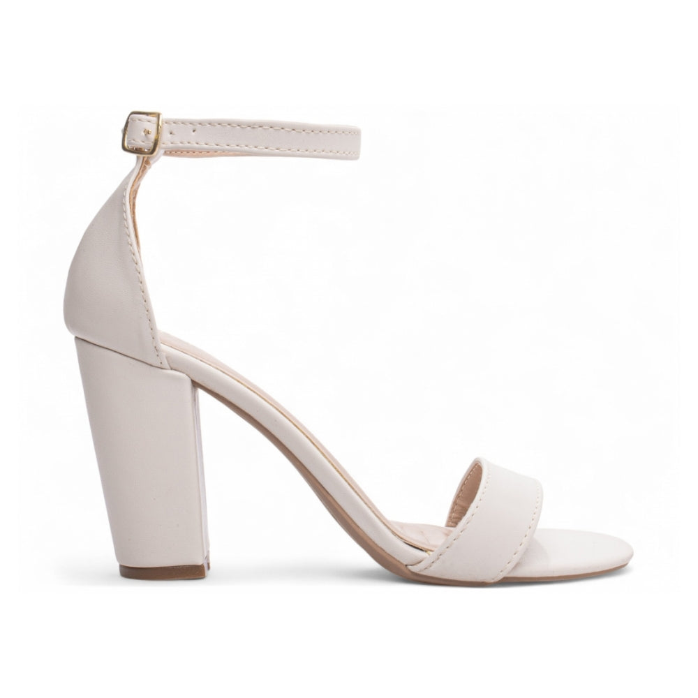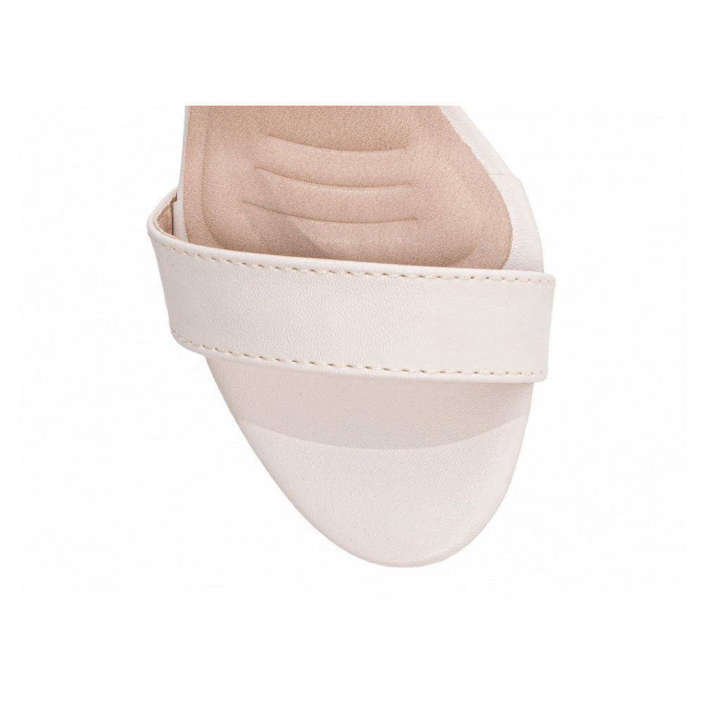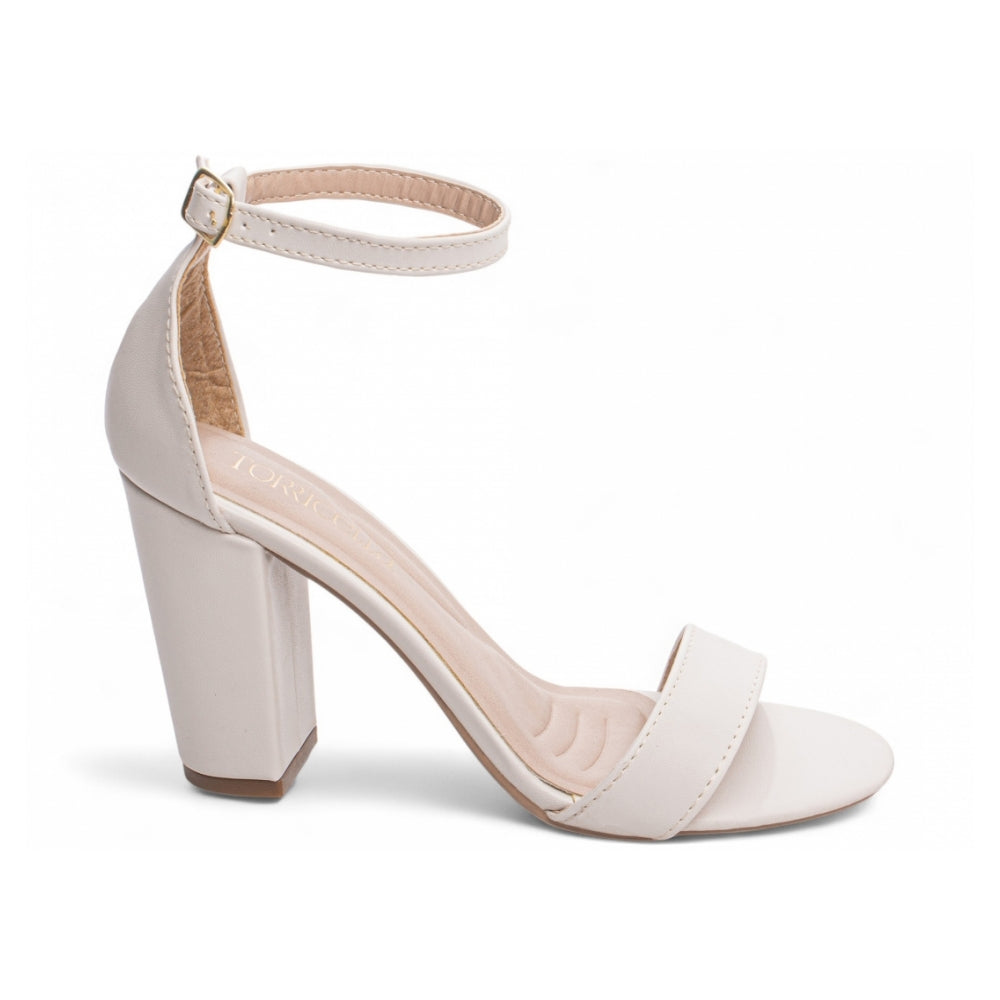Sandália feminina off white, salto bloco 9 cm, fivela dourada ajustável, solado antiderrapante, palmilha macia. Conforto e sofisticação garantidos!